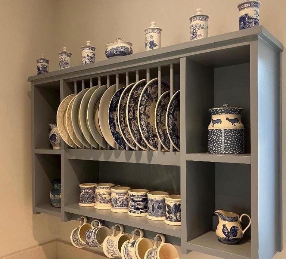 This plate rack holds 14 plates up to 300mm in diameter and comes with a lower shelf, suitable for bowls. The Crich also features a dowel cup bar, suitable for holding 6 mugs, and two side compartments with further plate holders.